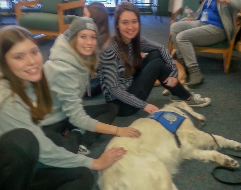 Now for the heartache visits. First, we joined other comfort dogs at a high school in the far west suburbs. It took an hour to get there. We were there to give students comfort. One of the very popular senior students was driving his mother to work about a week before when they were involved in a car accident. Both the student and mother were killed. The student body was in shock. I was there for a little more than three hours. Four dogs, including me, were in the school library. Many students came to see us. Many sat on the floor next to me and petted me for nearly an hour. Students were wearing special wrist bracelets with the name of the student who died. Students thanked us for being there.