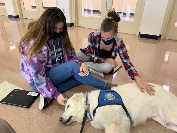 In recent years, we been visiting high schools, colleges, and businesses for “de-stress” purposes. We comfort dogs have the ability to help people relax. This time we visited Prairie Ridge High School in Crystal Lake. We were there with another dog. During several hours, I was able to visit with a large group of students, which made them very happy.