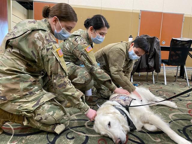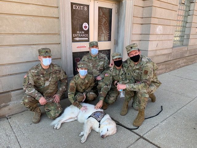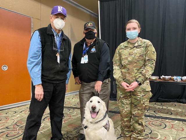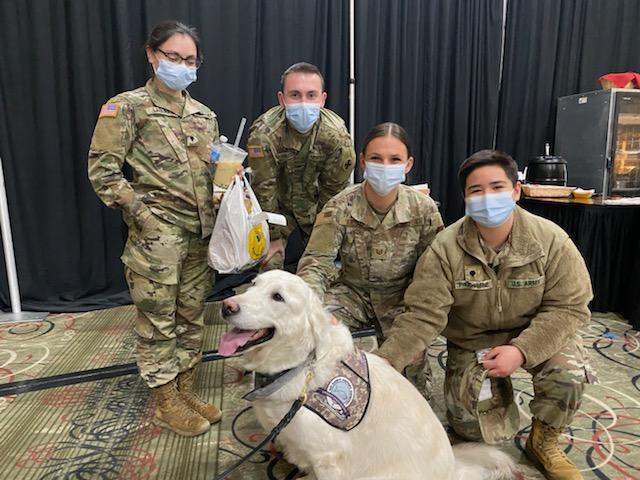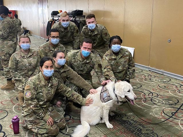 At these locations, I usually arrived between 11 to 11:30 AM and stayed until 2 PM. My handlers and I visited with two groups: National Guard personnel and people getting vaccinations. For the military, I would meet them in their break room during lunch hour. Due to the number of times I made these visits (seven in March), the military got to know me very well. I
