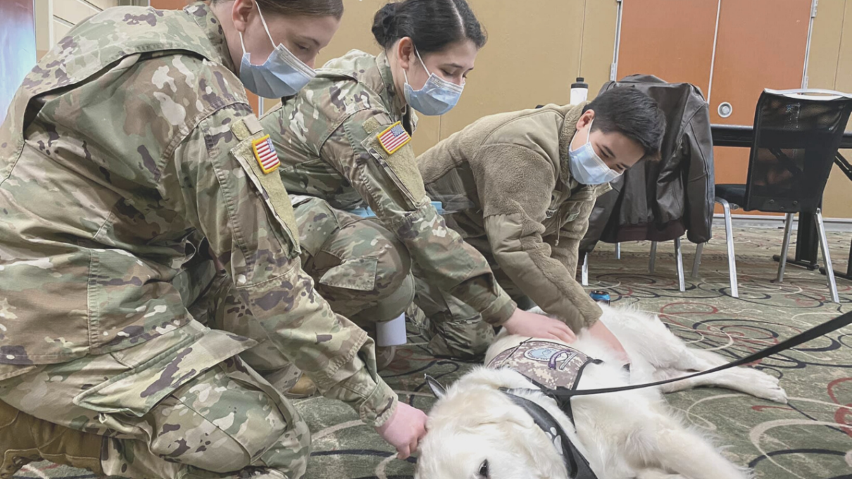 At these locations, my handlers and I visit with two groups: National Guard personnel and people getting vaccinations. For the military, I would meet them in their break room during lunch hour.