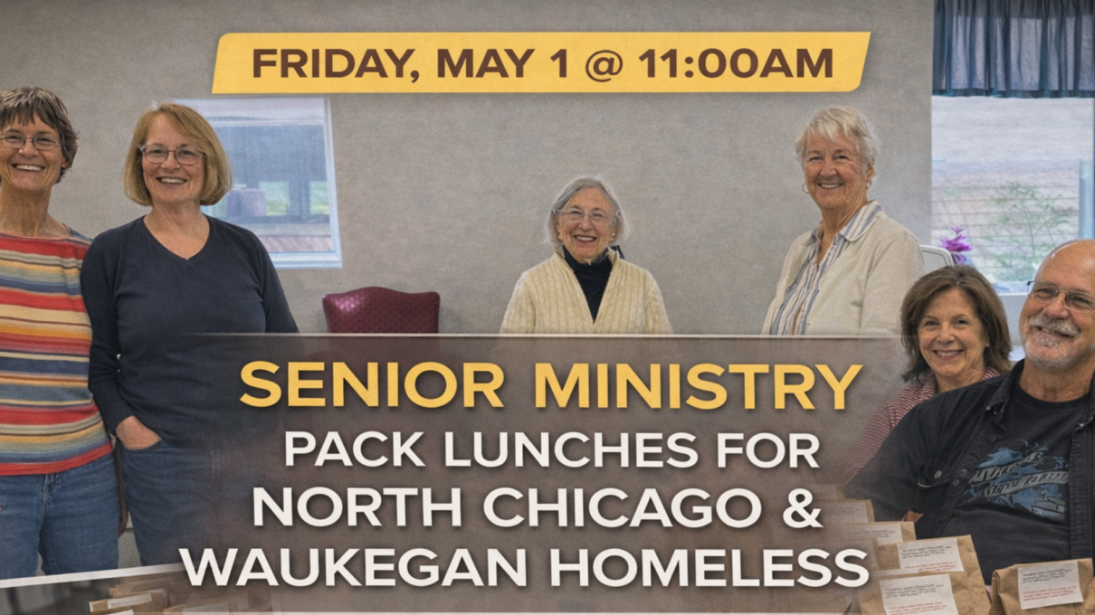 Friday, May 1 @ 11:00AM | SENIOR MINISTRY: PACK LUNCHES FOR NORTH CHICAGO & WAUKEGAN HOMELESS | Held in Faith kitchen. Seniors’ will meet for their monthly first-Friday activity to pack lunches and a message of God’s love for individuals facing housing insecurity in North Chicago and Waukegan. Sign-up is NOT necessary.