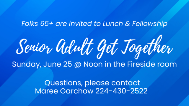 Sunday, June 25 @ Noon | SENIOR ADULT GET-TOGETHER | Folks 65+ are invited to Lunch & Fellowship. Questions, please contact Maree Garchow.